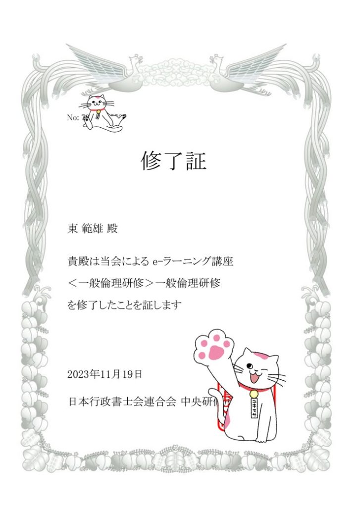 日本行政書士会中央研修所主催の一般倫理研修を受講しました。eラーニングで3時間じっくりと学習しました。